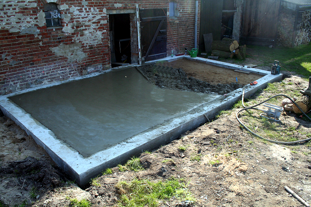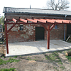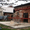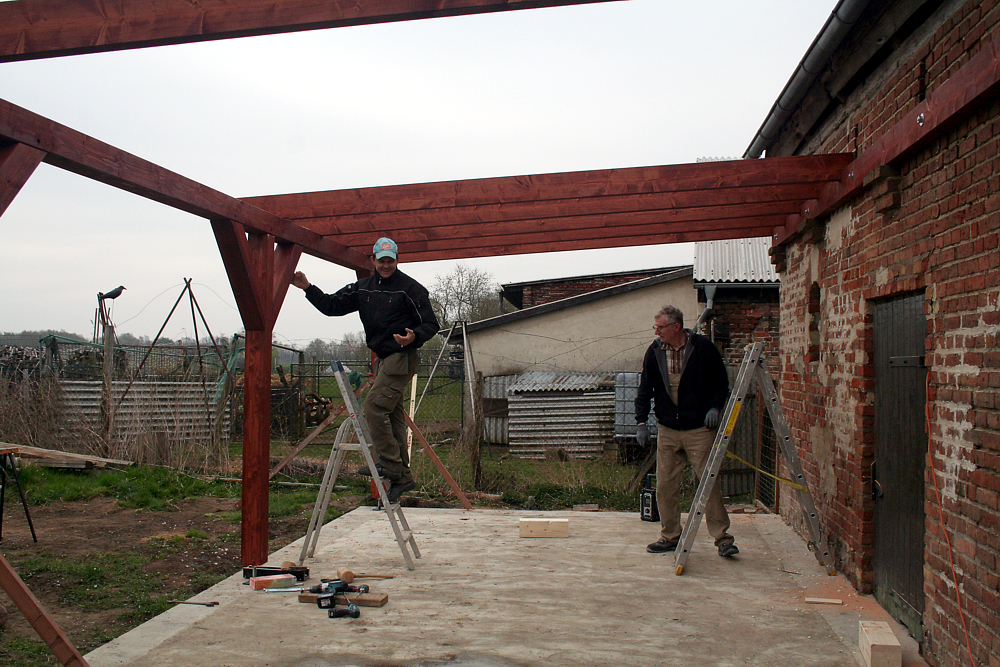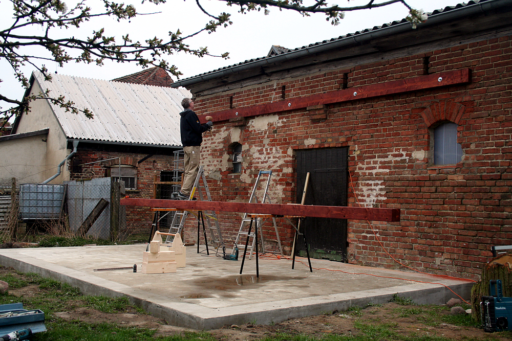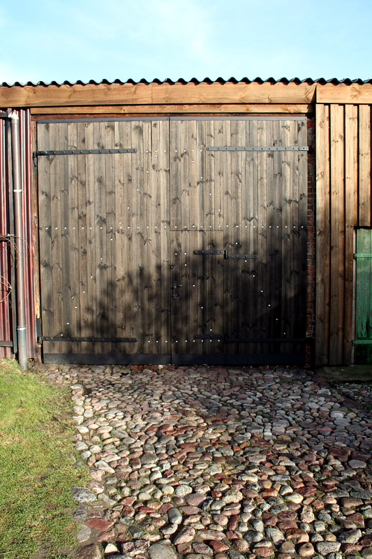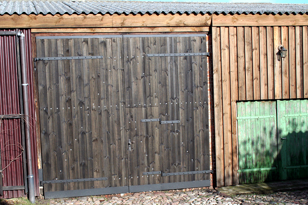 Fassade der Scheune mit Holz verkleidet und ein Scheunentor mit separater Tür neu eingebaut.